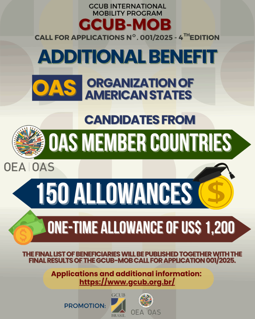 The Executive Director of the International Cooperation Group of Brazilian Universities – GCUB, in the use of her legal attributions, considering the signing of the Memorandum of Understanding between the GCUB and the Organisation of American States (OAS), includes the following information to the GCUB-Mob Call for Applications No. 001/2025: