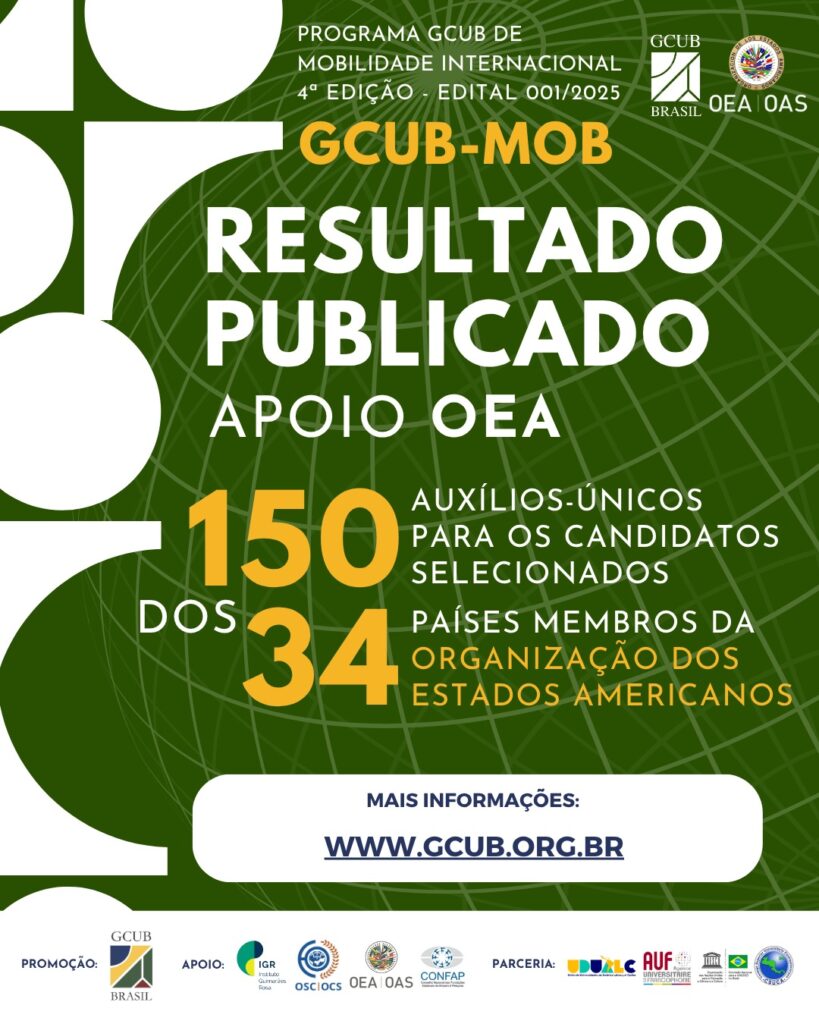 El Grupo de Cooperación Internacional de Universidades Brasileñas (GCUB) tiene el placer de divulgar la lista de los(as) candidatos(as) seleccionados(as) para recibir los subsidios ofrecidos a través de la colaboración entre el GCUB y la Organización de los Estados Americanos (OEA).